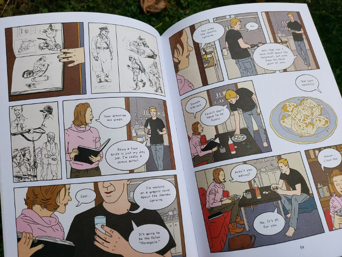 Mica viettää aikaa Varsovaa kierrellen, ja sattuman kautta hän tutustuu kiinnostavaan nuoreen mieheen, joka ryhtyy Micalle oppaaksi. No, kyllähän siitä hieman muutakin säpinää syntyy, ja minusta Mican herttainen romanssinpoikanen oli ihan kiva lisä sarjakuvan tapahtumiin. Mikään erityisen vauhdikas juoni ei silti ole kyseessä, pikemminkin lukija pääsee mukaan aika verkkaan edistyvälle kaupunkilomalle, jossa pengotaan menneisyyden sukusalaisuuksia, kun sopiva hetki koittaa.
